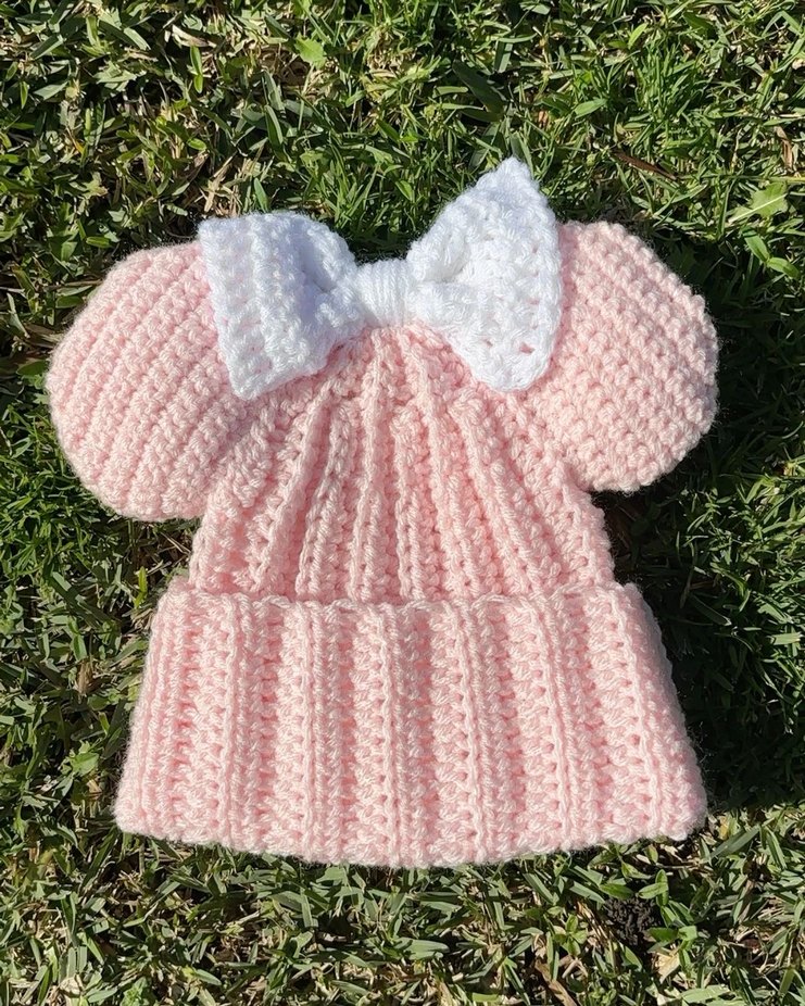 Pastel pembe renkte, beyaz işlemeli fiyonk ve yuvarlak kulak detaylı örgü kız çocuk beresi, yumuşak ve şirin bir görünüme sahiptir.