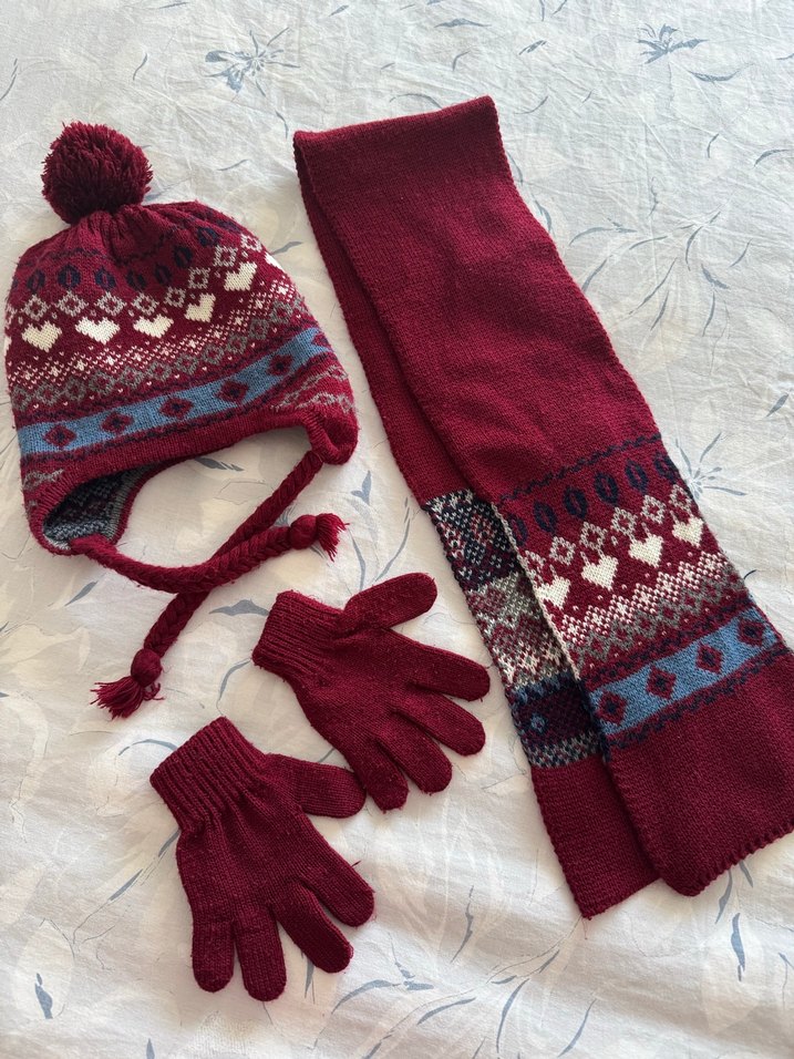 Bordo renkte, ponponlu bere, nakışlı desenli atkı ve uyumlu eldivenlerden oluşan örgü çocuk seti. Şapkanın içi peluş bu yüzden cok sıcak tutuyor.