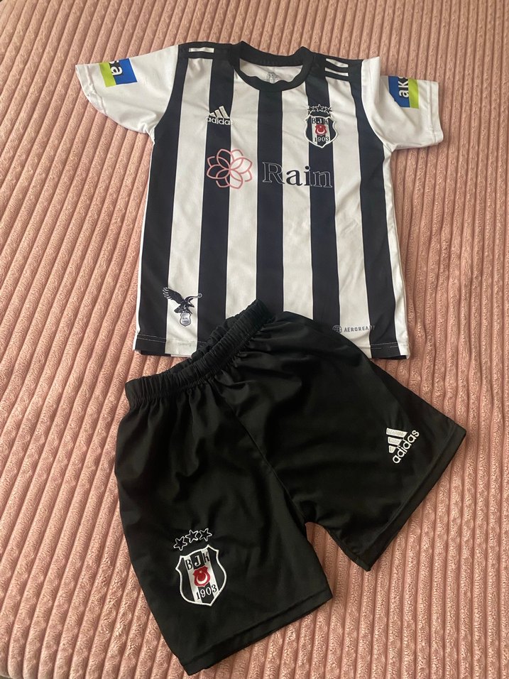 Beşiktaş lisanslı kısa kollu forması ve şortu, yuvarlak yaka, sentetik kumaş ve cırt cırt detaylıdır. Formada siyah-beyaz çizgiler, şortta siyah renk ve logo bulunur.