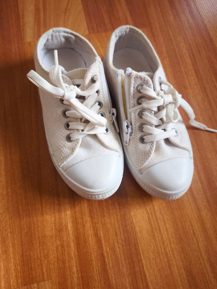Beyaz renkli, bağcıklı ve yan fermuarlı çocuk spor ayakkabısı. Lastik tabanlı, trend sokak stili için uygun. Hafif ve desensiz tasarım.
