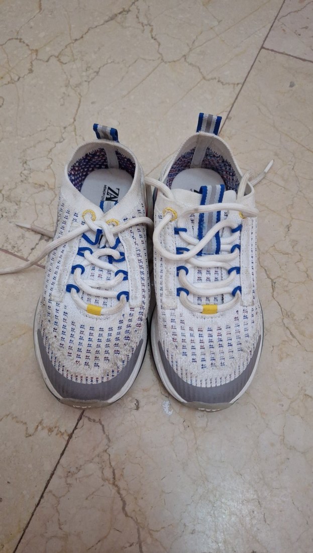 Beyaz bağcıklı cocul spor ayakkabısı, düz kauçuk tabanlıdır. Gri detayları ve hafif desenli yapısıyla spor ve günlük kullanıma uygundur.