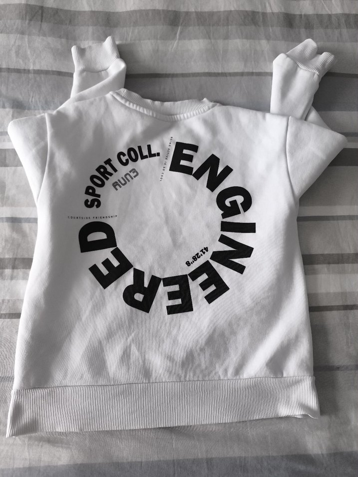 Pamuk kumaştan, fitted kesim beyaz sweatshirt, yuvarlak yaka ve kısa kollu. Üzerinde siyah baskılı 'ENGINEERED SPORT COLL' yazısı ve tokalı detay bulunur. ♀️