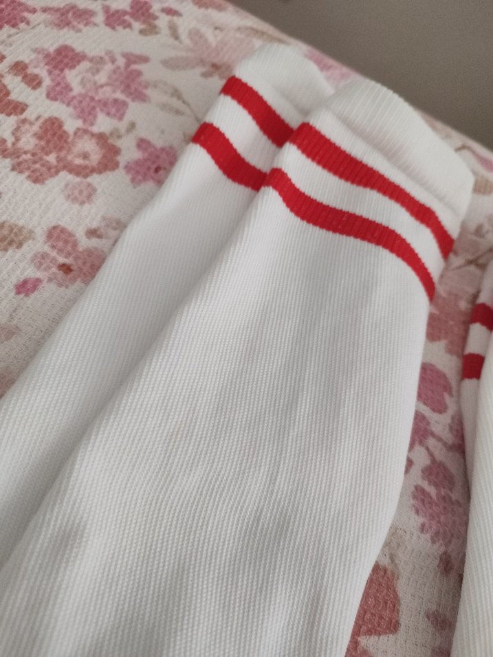 Sentetik kumaştan yapılmış, renkli kırmızı çizgili beyaz çocuk çorabı. Rahat ve şık. uzun çorap