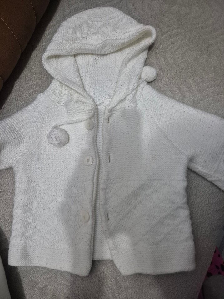 Uzun kollu, düğmeli ve kapüşonlu, beyaz renk çocuk hırkası. Örgü kumaştan yapılmıştır