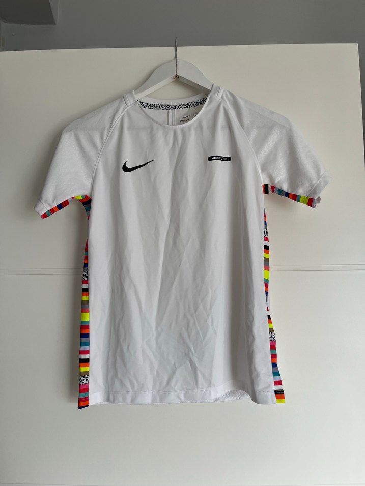 Bu çocuk beyaz kısa kollu tişört, dar kesim ve yuvarlak yakaya sahip. Sentetik kumaştan, renkli baskılı yan detaylar ve cırt cırtlı özellik içerir. ⚡