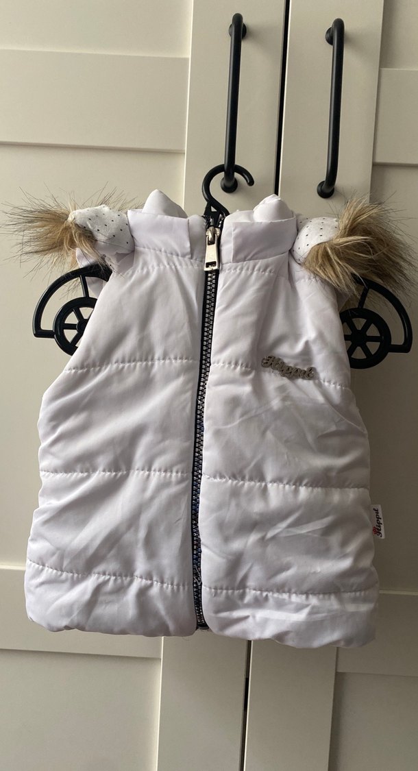 Unisex model çıkarılabilen Kürk detaylı kapüşonlu, beyaz, kolsuz yelek. Baskılı iç astarlı, dar kesim, trend sokak tarzı için uygun. Bazı yerlerinde lekeler var görsellerde mevcut 6-12 ay ama kalıbı bir tık küçük ve dar.