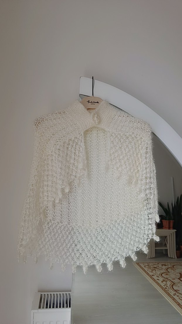 Çocuklar için örgü beyaz, parlak dokulu şal. Rahat ve bohem tarzda, katmanlama için uygun.