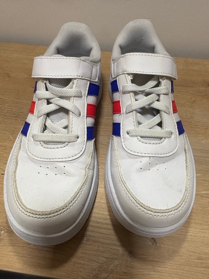 Beyaz renkli, renkli çizgili detaylara sahip, cırt cırtlı ve kauçuk tabanlı erkek çocuk spor ayakkabısı.
