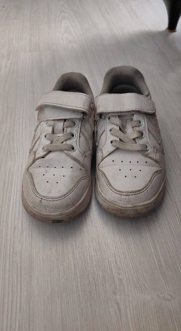 Gri tonlarda, tokalı bantlı ve kauçuk tabanlı beyaz çocuk spor ayakkabısı. Rahat ve kullanımı kolaydır.