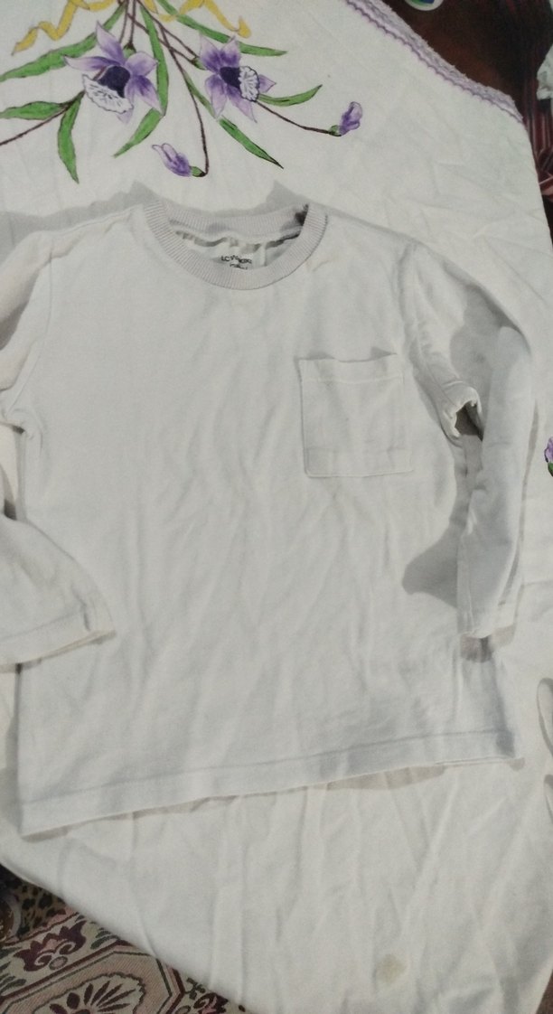 Çocuklar için beyaz uzun kollu tişört, yumuşak dokulu ve küçük bir göğüs cebine sahip. Rahat ve sade tasarım.