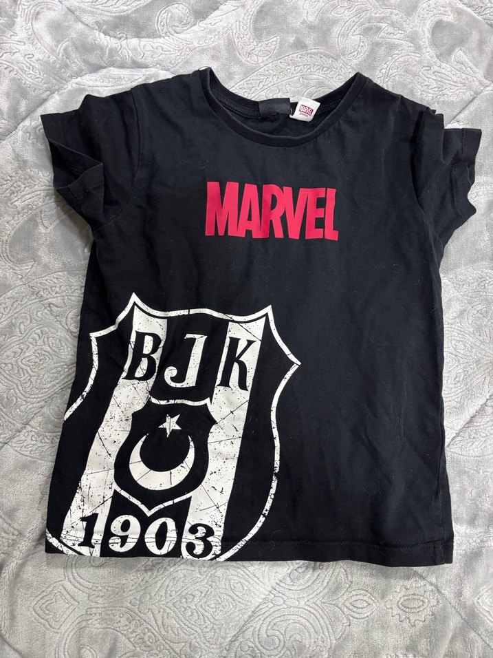 Siyah renkli, kısa kollu tişört. Marvel ve Beşiktaş 1903 baskılı temizdir