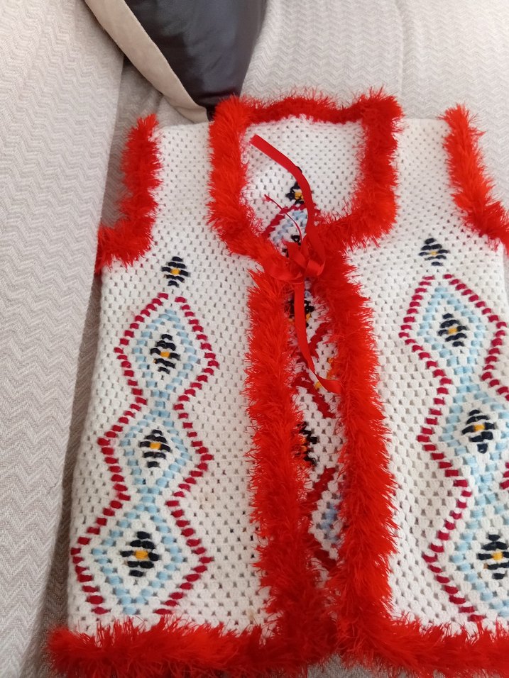 Renkli nakışlı desenlere sahip, kırmızı tüylü kenar detaylı, V yaka ve kolsuz, fitted örgü çocuk yeleği.