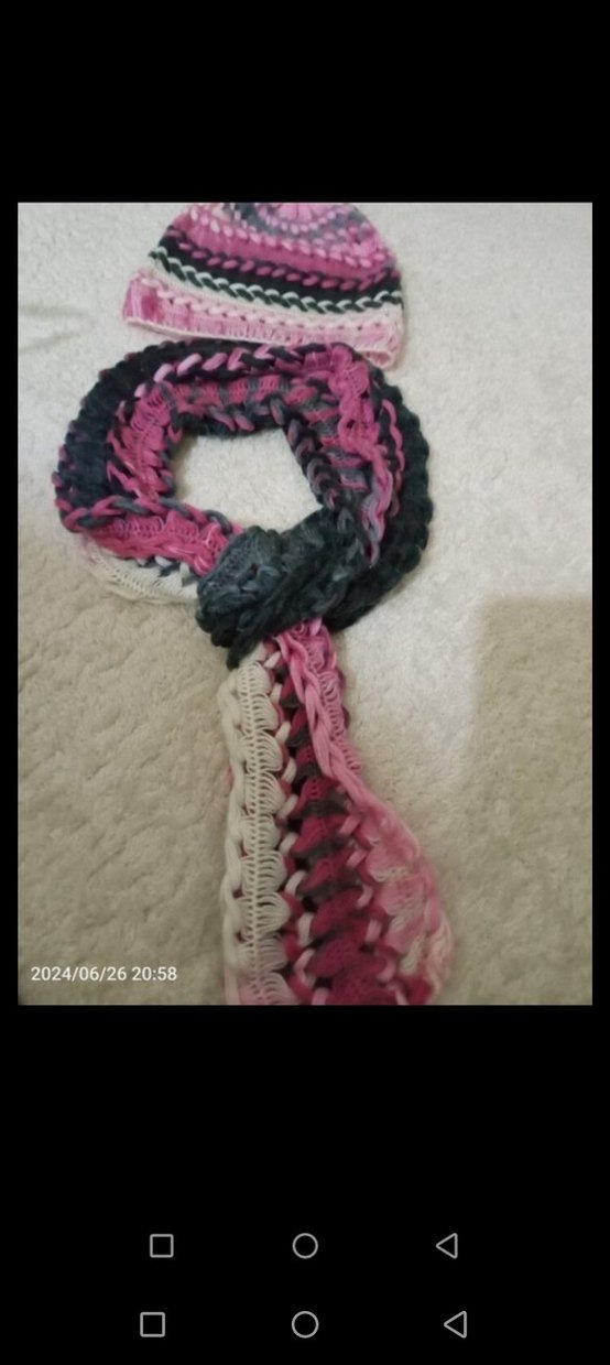 Çocuklar için çok renkli, gri ve pembe tonlarında bohem tarzda örgü bere ve atkı seti.