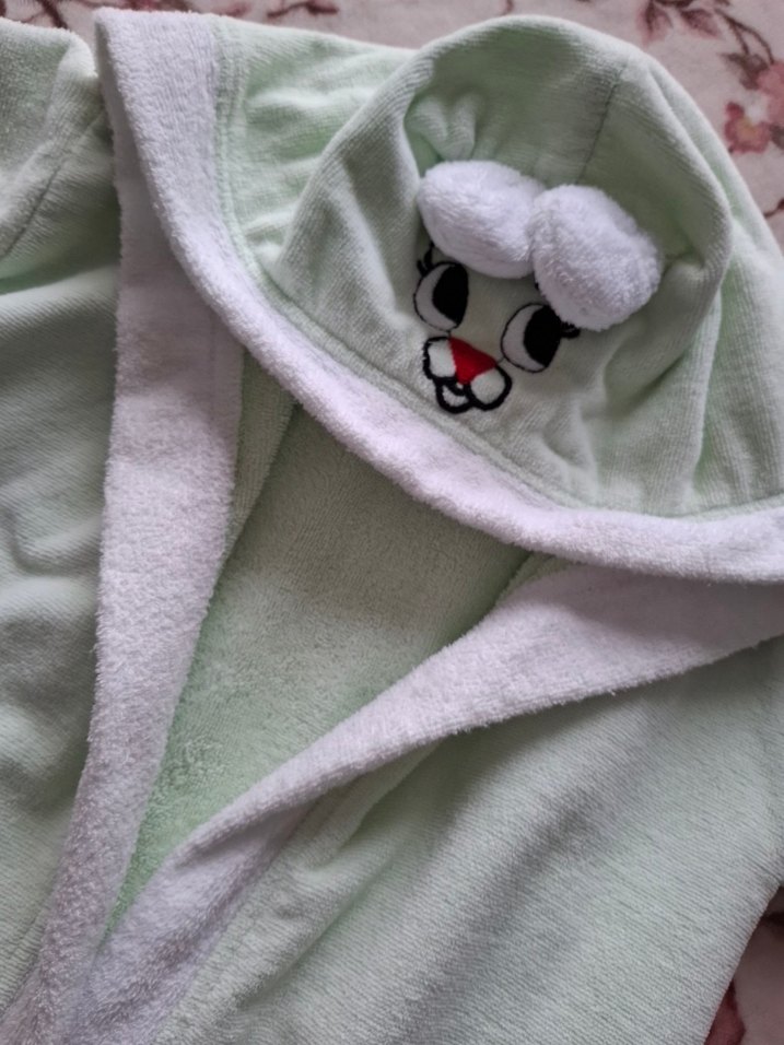 Nakışlı kapüşonlu, yumuşak ve sıcak kumaştan yapılmış pastel beyaz kız bornozu. Rahat ve sevimli detaylara sahip. 7 8 yaş