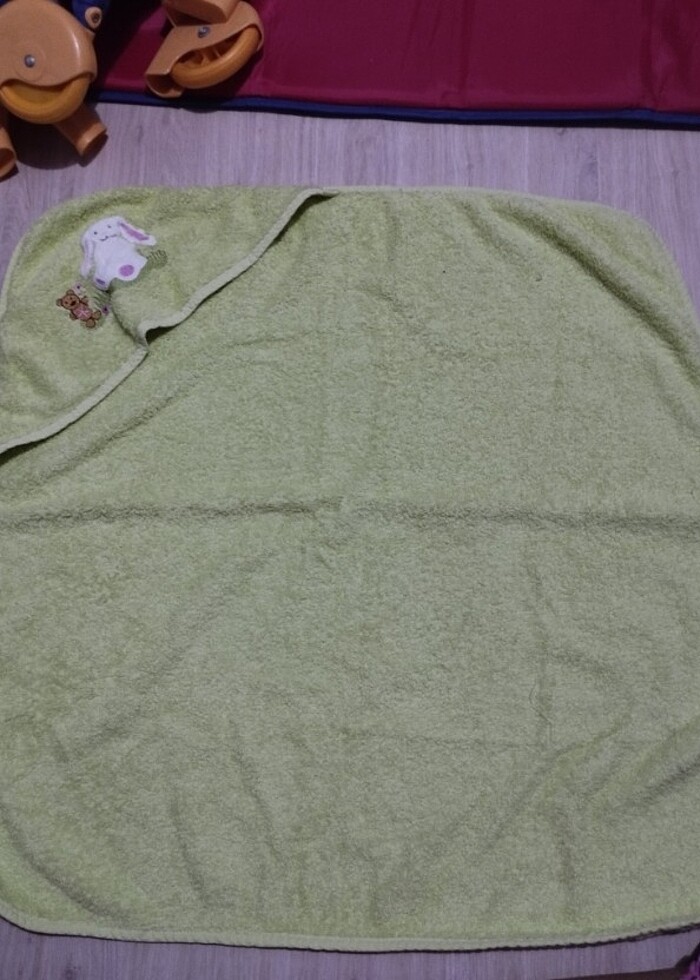 Çocuk bornoz takımı. Unisex. Bir buçuk yaş itibariyle kullanılabilir. Yeşil renkte. Havlu ve bornoz.