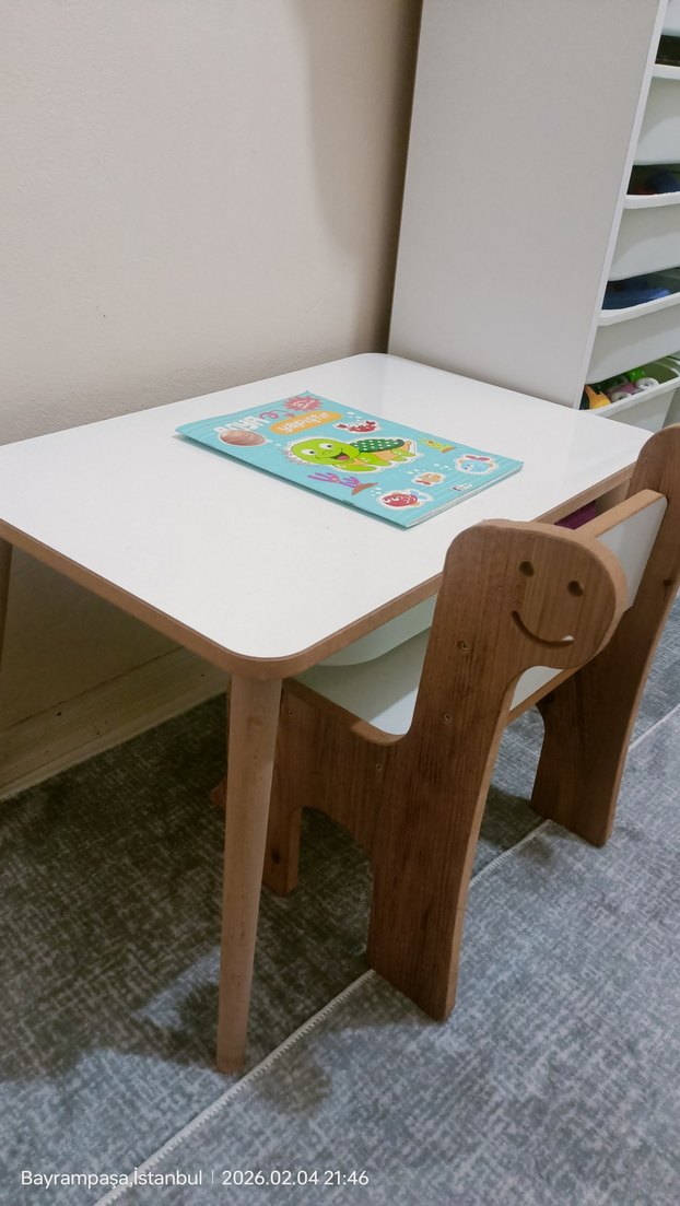 MDF çerçeveli, beyaz pastel renkte, sırt kısmında gülen yüz tasarımlı çocuk sandalyesi. masa altında çekmece mevcut Rahatlık ve eğlenceli detaylar