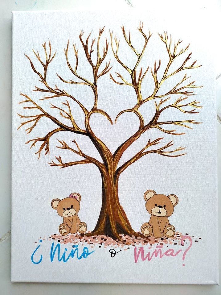 İstediğiniz karakterli çizilebilir. Tuval 30 /40dır daha büyük istenirse hazırlanabilir. İki oyuncak ayıcık ve 'Çocuk mu kız mı?' sorusu içeren ağaç çizimiyle sanat kitabı. Cinsiyet belirleme temalı. İstenirse çerçeveli de gönderilir.