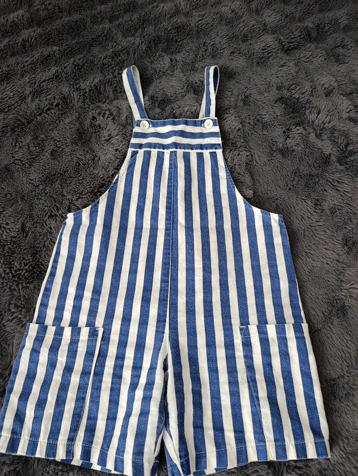 çocuklar için düğmeli askılı, çizgili, bol kesim kot şort salopet. 9/10 yaş uyumlu koton marka çok tarz duran bir ürün