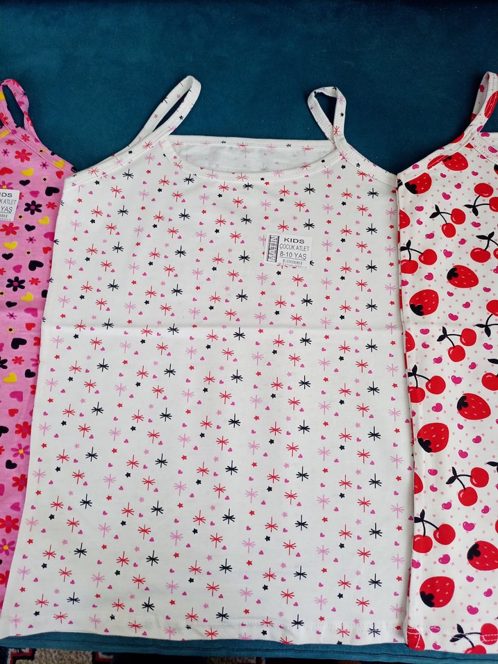 İnce askılı, çok renkli yıldız ve çiçek desenli çocuk baskılı atlet.