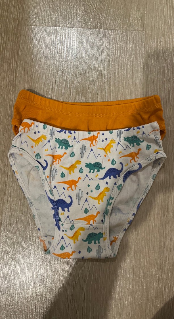 Çocuklar için tek renk turuncu ve çok renkli dinozor desenli iki adet rahat ve yumuşak kumaştan külot.