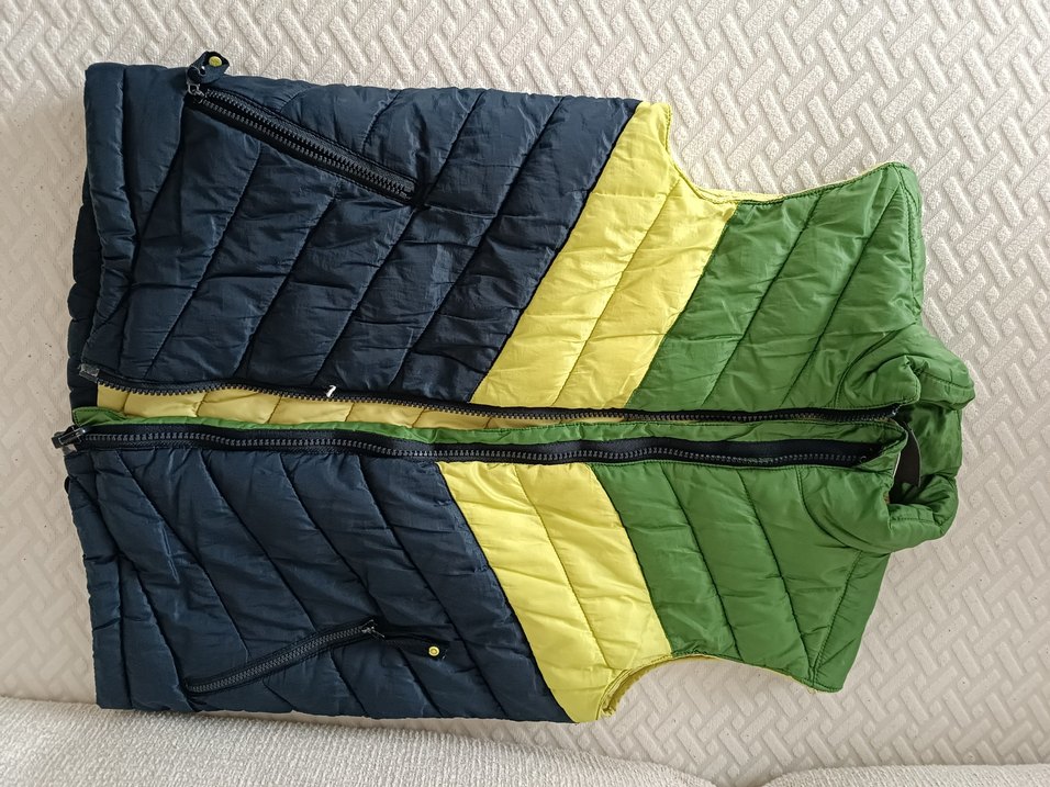 Çocuklar için fermuarlı, kolsuz yelek. Sentetik kumaştan üretilmiş, fitted kesim ve çentikli yaka ile çok renkli modern tasarım sunar.