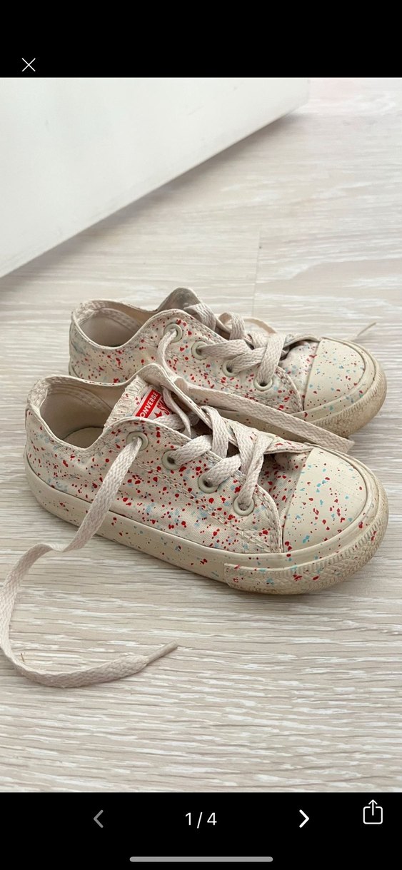 Beyaz renkte, pastel tonlarda tie-dye desenli, elastik detaylı ve kauçuk tabanlı çocuk converse. Çok az kullanıldı