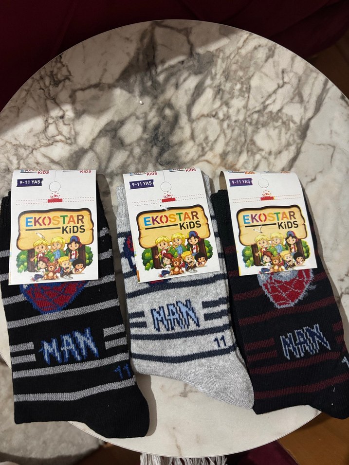 9-11 yaş çocuklar için çok renkli baskılı ve "MAN" yazılı üç çift çorap seti. Gri ve farklı tonlarda, rahat ve kullanışlıdır.