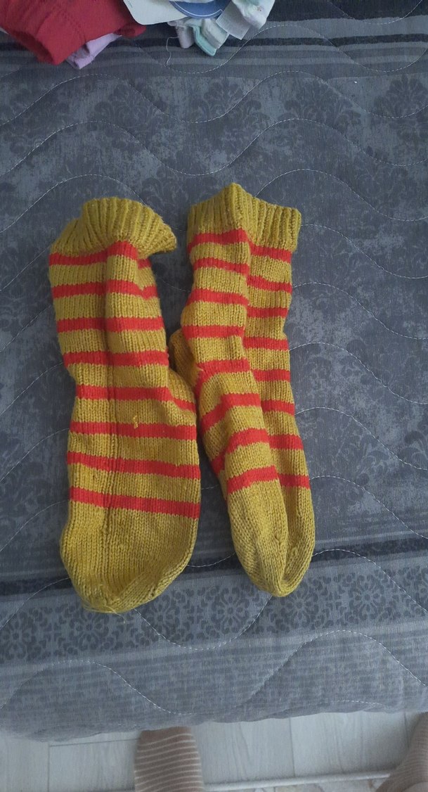 Çocuk çorapları sarı ve kırmızı çizgili, yumuşak kumaştan rahat kullanım sağlar. altında ufak sökük var