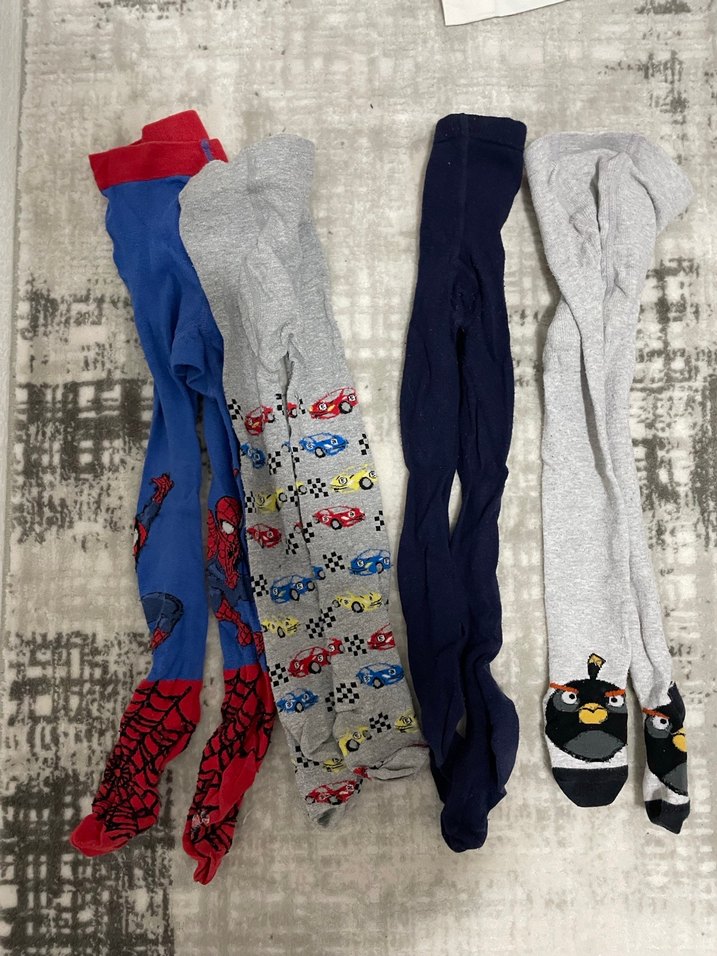 Yumuşak ve sıcak kumaştan yapılmış, renkli ve desenli dört adet çocuk külotlu çorap seti. Araba ve çizgi film karakteri desenleri içerir.