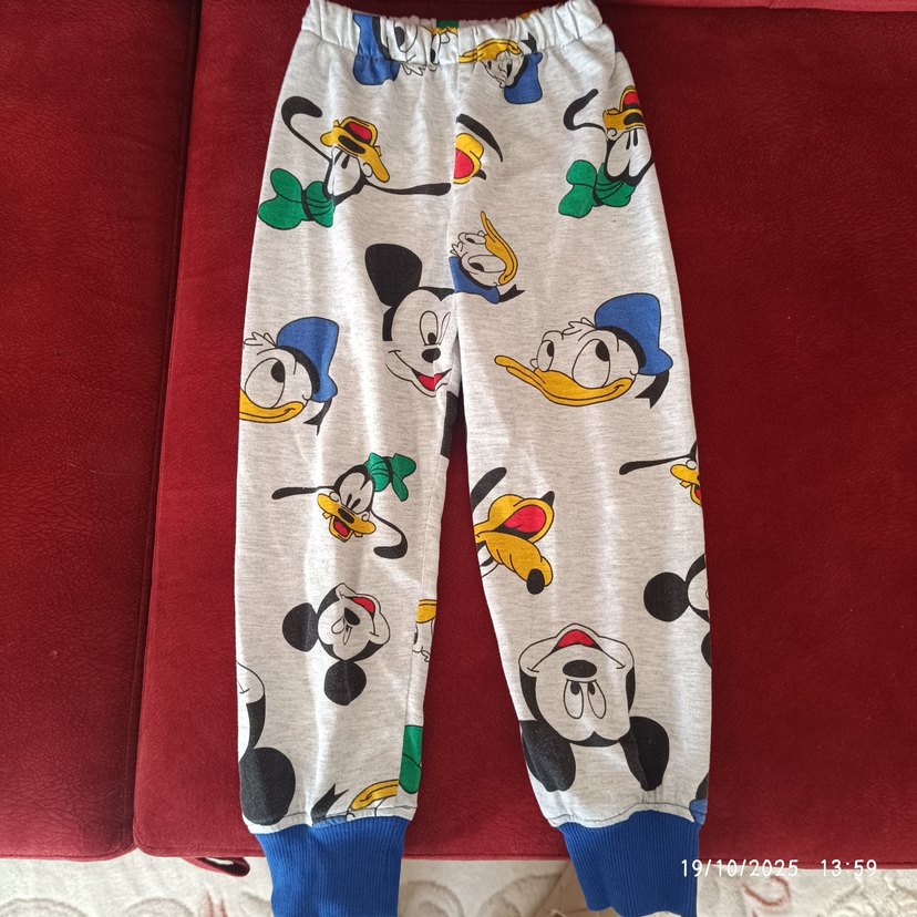 Rahat kesimli, gri taban üzerine renkli Disney karakter baskılı eşofman altı. Yumuşak sentetik kumaştan, mavi örme manşetli.