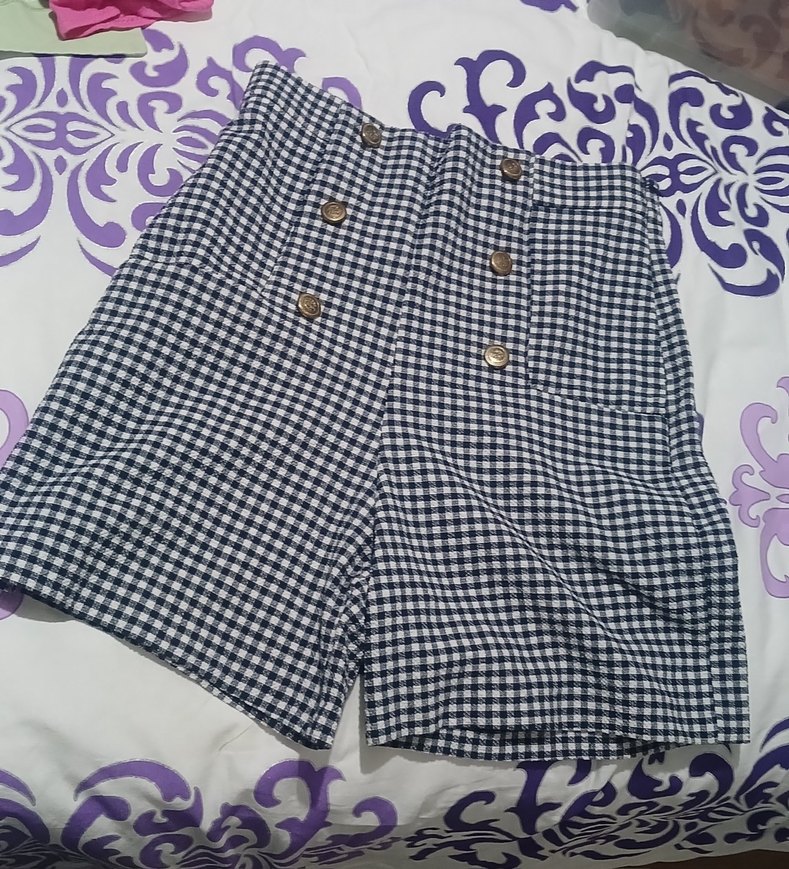 düğmeli detaylı, kareli desenli, bol kesim mini şort. Günlük sokak stili için uygundur.