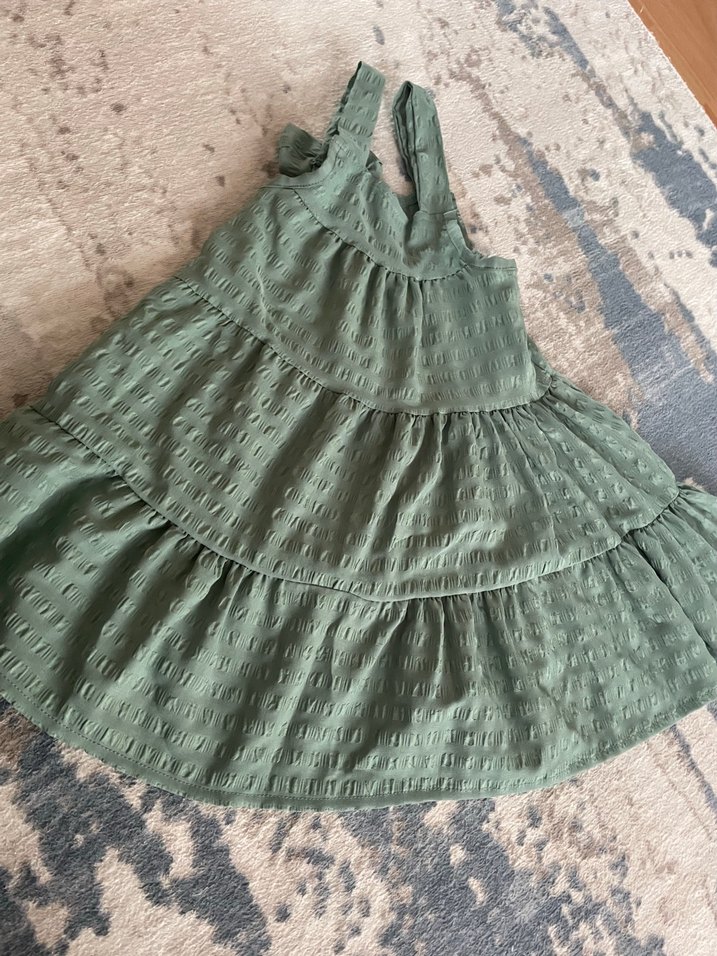 Yumuşak , askılı ve fırfırlı katmanlara sahip, bol kesim haki uzun elbise. Bohem tarzda, günlük . 2,5 -3 yas arasi