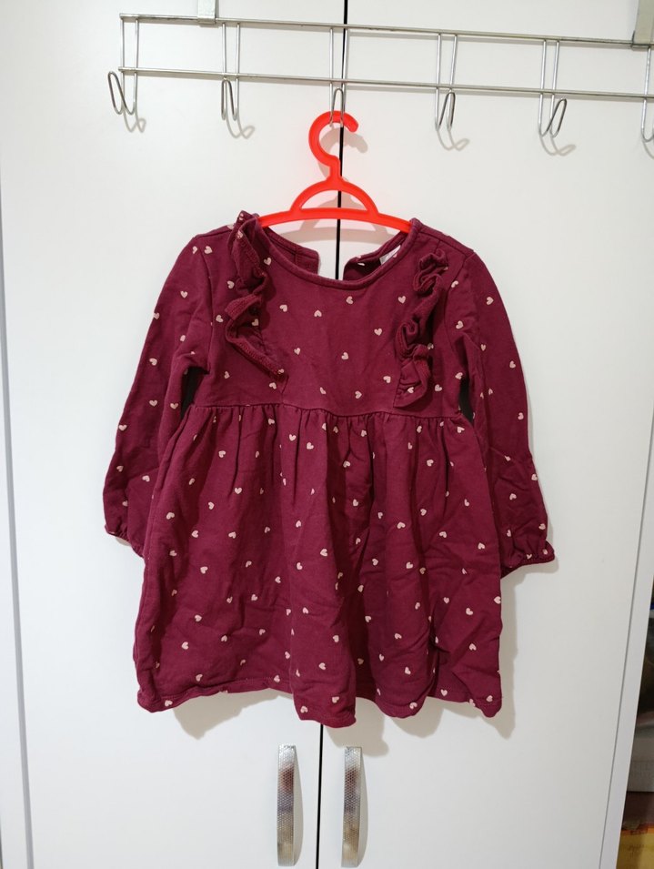 Bordo renkli, uzun kollu kız çocuk elbisesi, renkli baskı ve fırfır detaylara sahip. Pamuklu kumaştan, salaş kesim ve yuvarlak yaka ile trendy casual tarzı için uygundur.