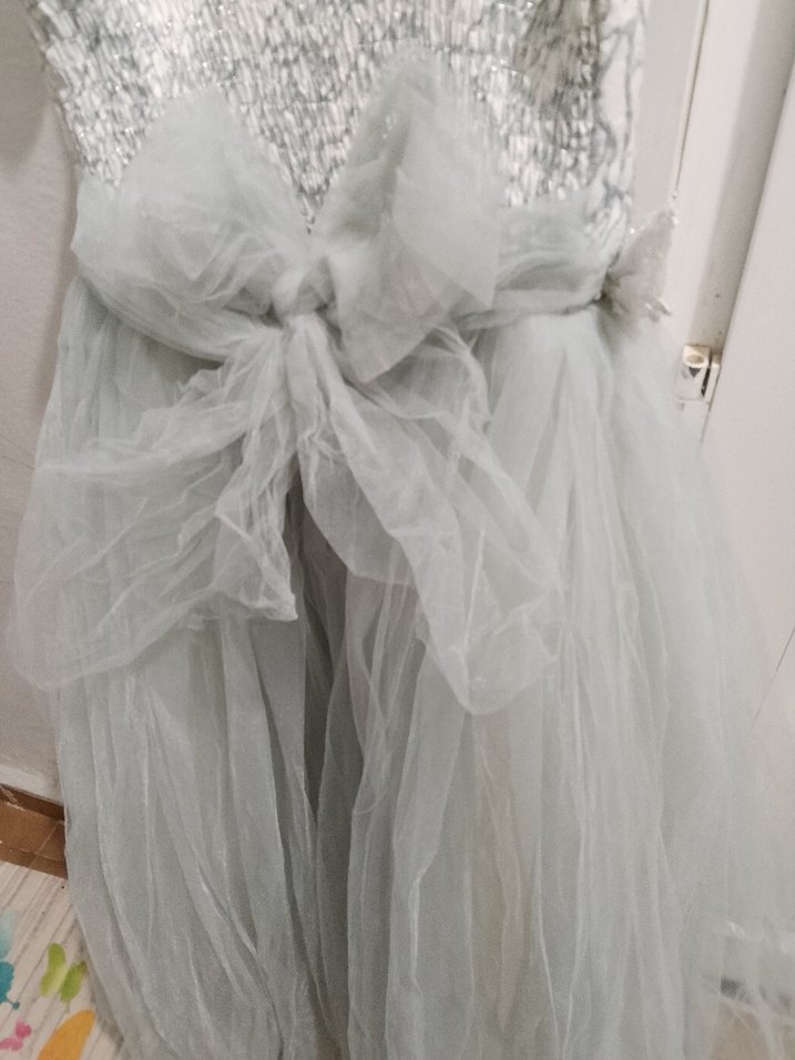 Bu uzun gri nişan elbisesi, drapeli ve nakışlı detaylarla fit kesime sahiptir. Straplez yakası ve ince askılarıyla bohem ve avangard tarzları birleştirir. Düğün için uygundur.