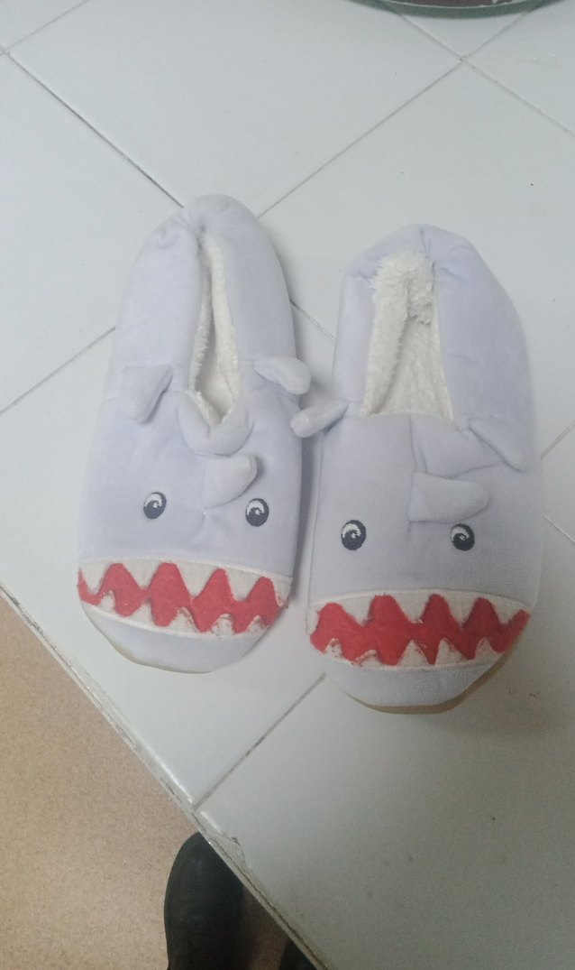 çocukları için mavi, yumuşak kumaşlı, köpekbalığı desenli ve fırfırlı sıcak ev terliği.