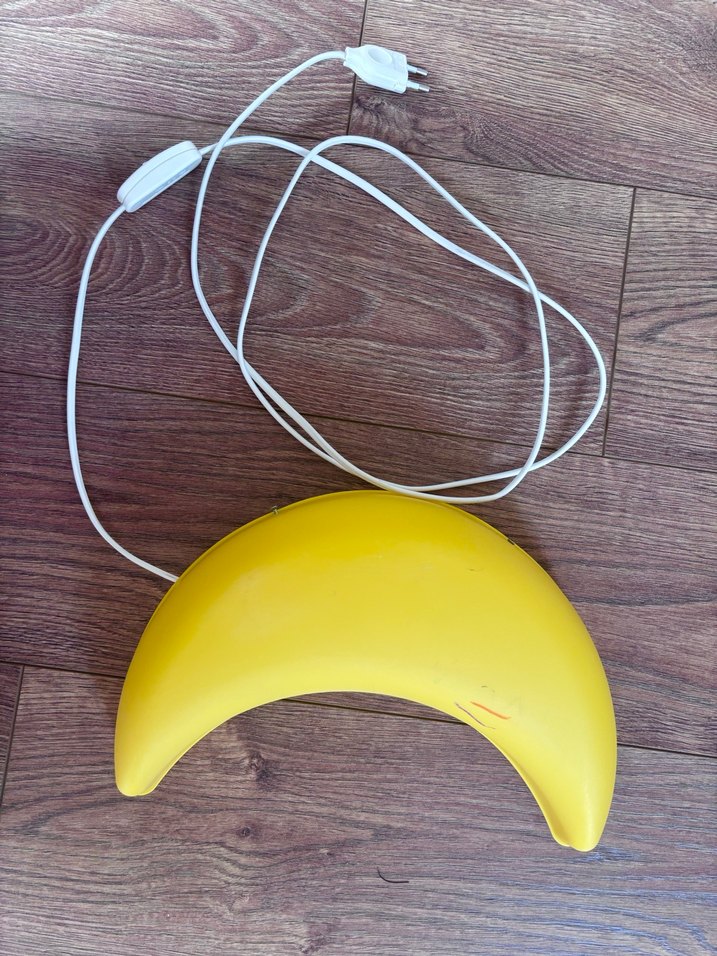 Beyaz kablo ve anahtara sahip sarı ay şeklinde masa lambası, yumuşak ortam aydınlatması sağlar.