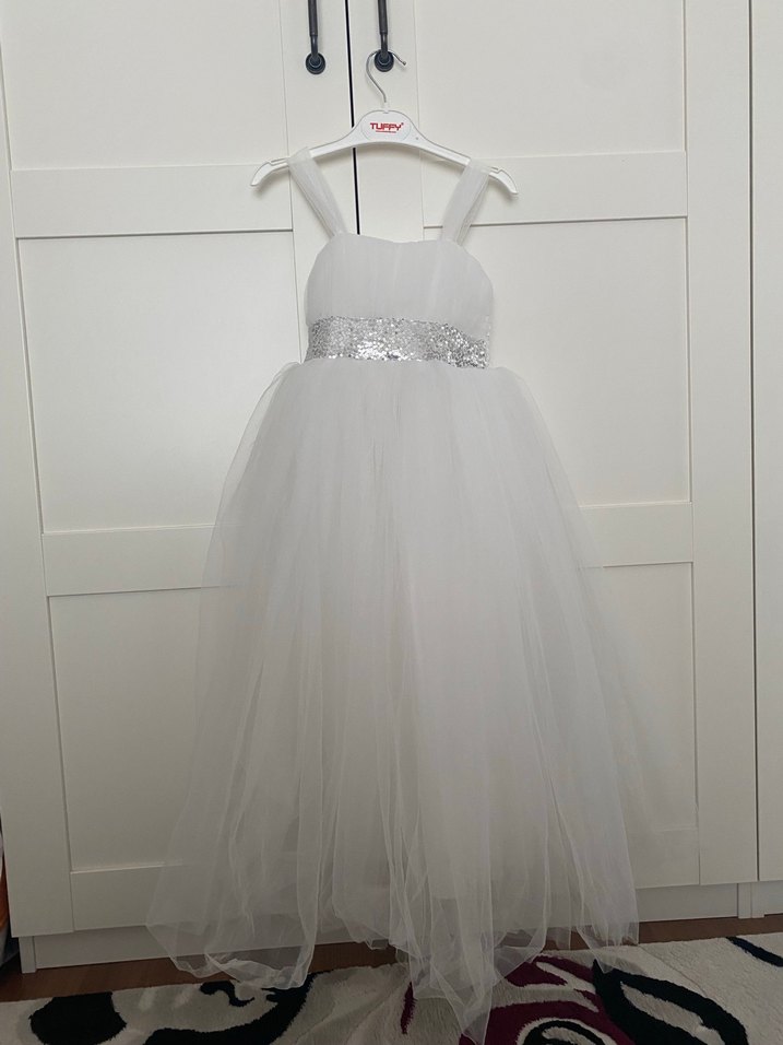 Bel ölçüsü (sadece ön parça) 25 cm, arkası lastikli. Boy omuzdan etek ucuna 92cm. Astar üzeri 2 kat tül. İki kere giyildi 1 kez yıkandı. Etek uçlarında yıpranma var. Etiketinde 6 yaş yazıyor ama benim kızım minyon olduğu için 7 yaşında giydi
