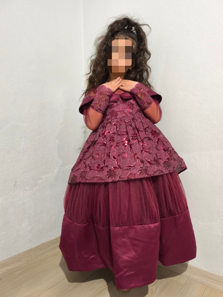 Bordo straplez çocuk elbisesi, uzun kollu ve detaylı nakışlı dantel süslemelidir. Bohem tarzda, bol kesim ve sentetik kumaştan yapılmıştır.