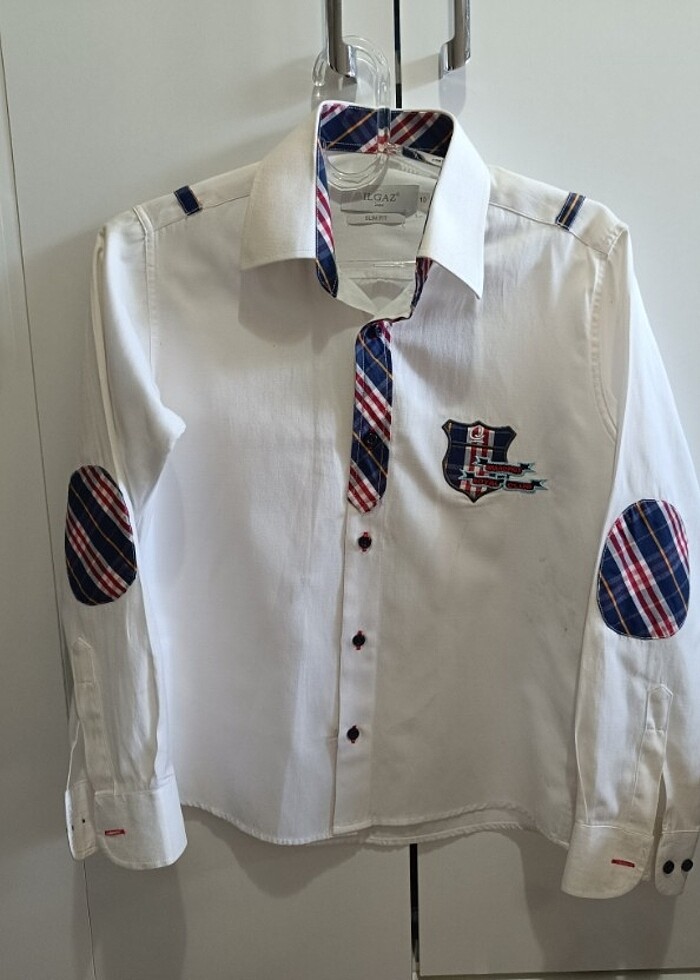 Beyaz renkli şeritli önünde kollarında renkli şeritli aplikeli desenler var iyi durumda temiz hiç bir yerinde deposu yok