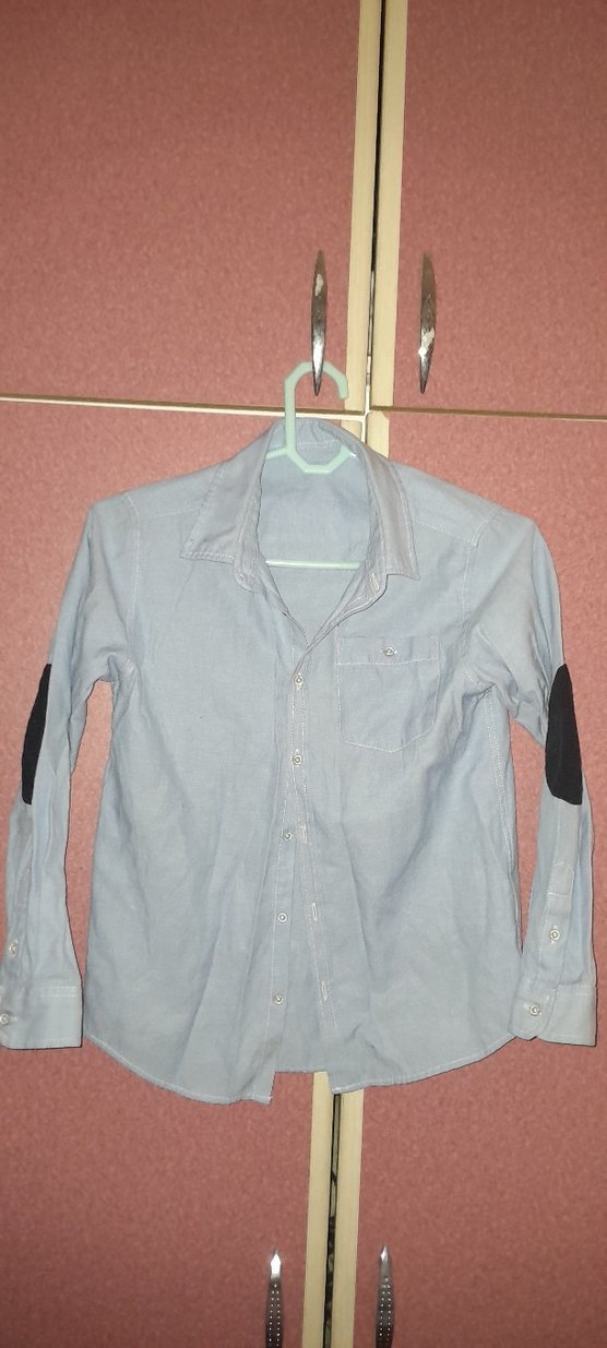 tatlı mzvi renk erkek çocuk, uzun kollu, yakalı ve düğmeli. Normal kesim ve küçük cep detayına sahiptir.dirseklerde yama modeli vardır.
