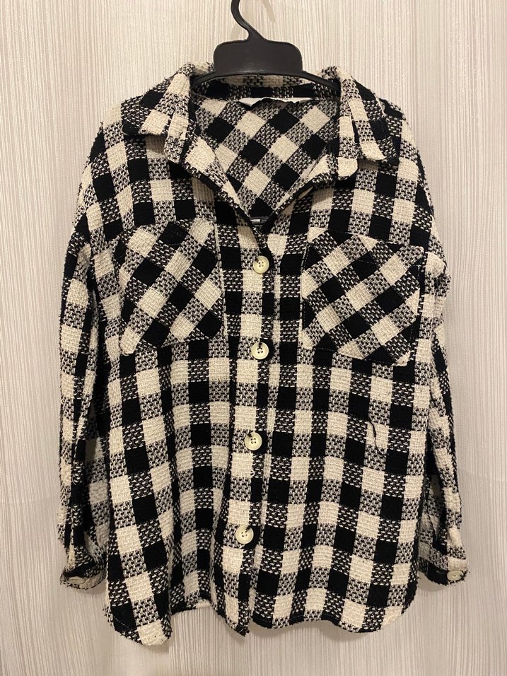 Cocuklar için beyaz-siyah ekose desenli, pamuklu, düğmeli, uzun kollu ve notched yaka detaylı gömlek. Rahat ve bol kesim, günlük şık sokak stili için uygundur.
