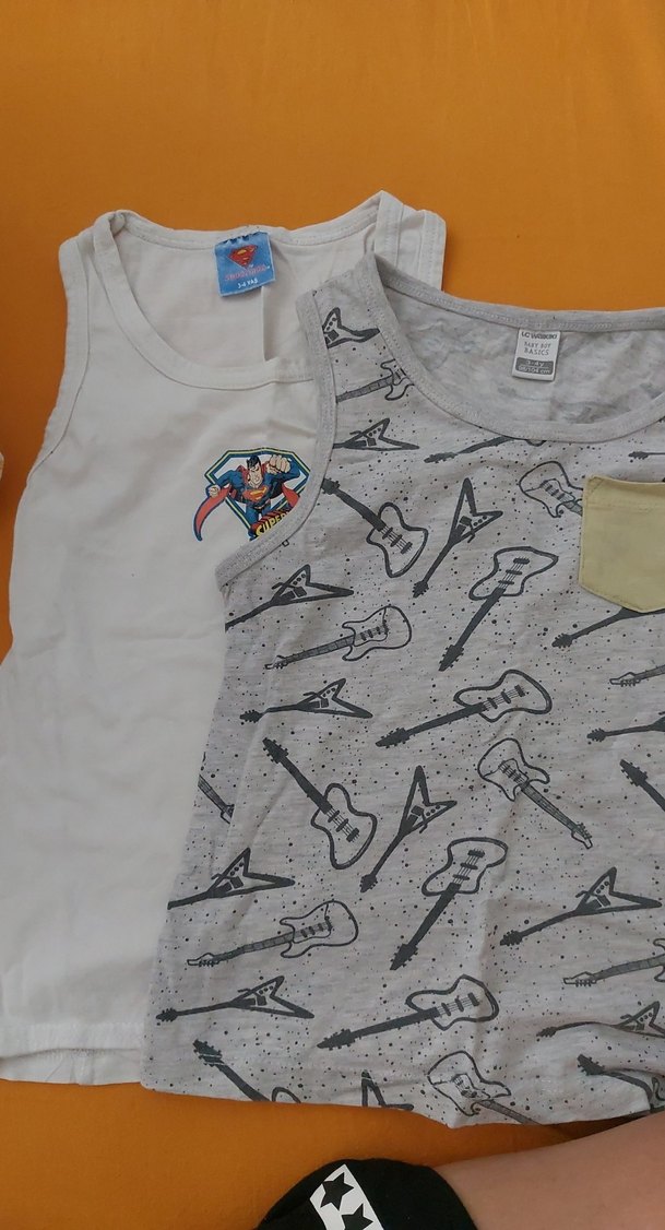 Gri tonlarda, biri gitar baskılı diğeri süper kahraman desenli 2 adet çocuk kolsuz atlet takımı.