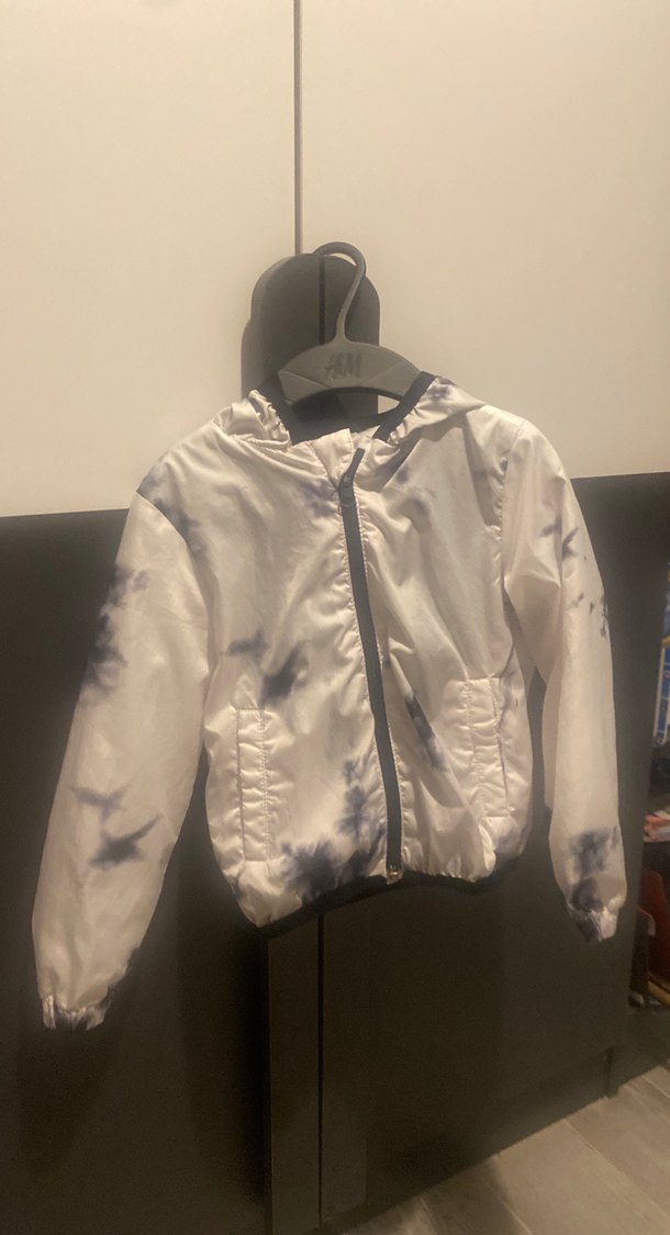 Fermuarlı, yüksek yakalı çocuk ceketi, gri beyaz bağlama desenli. Yumuşak ve rahat fleece kumaştan, trend sokak giyimi tarzında. İçi file yağmurluk tarzında. Hiçbir kusuru yok. Mevsim geçişlerinde kullanıldığı için çok az kullanıldı.
