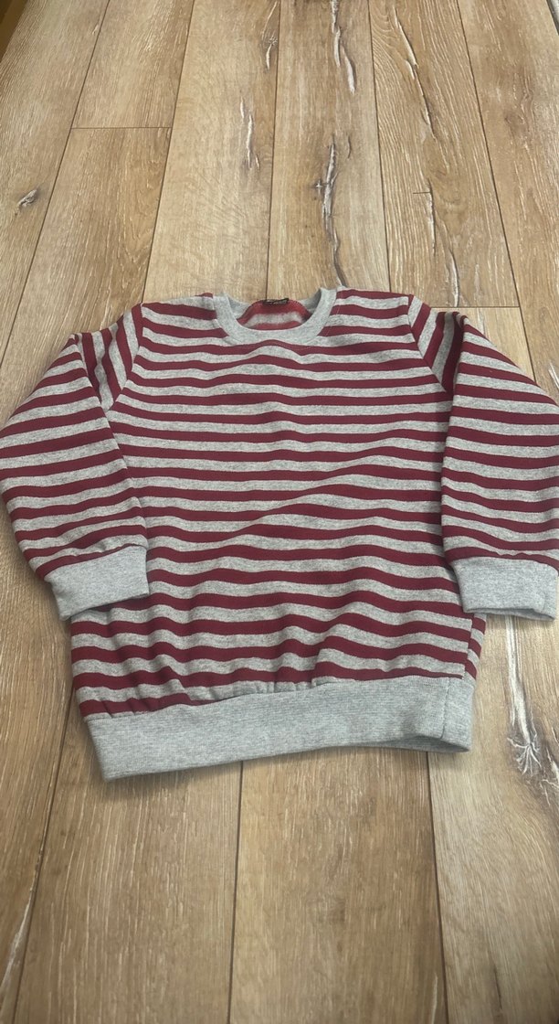 Uzun kollu, bisiklet yaka ve bol kesim çocuk sweatshirtü. Gri renkli, çizgili ve yumuşak dokulu örme kumaştan yapılmıştır.