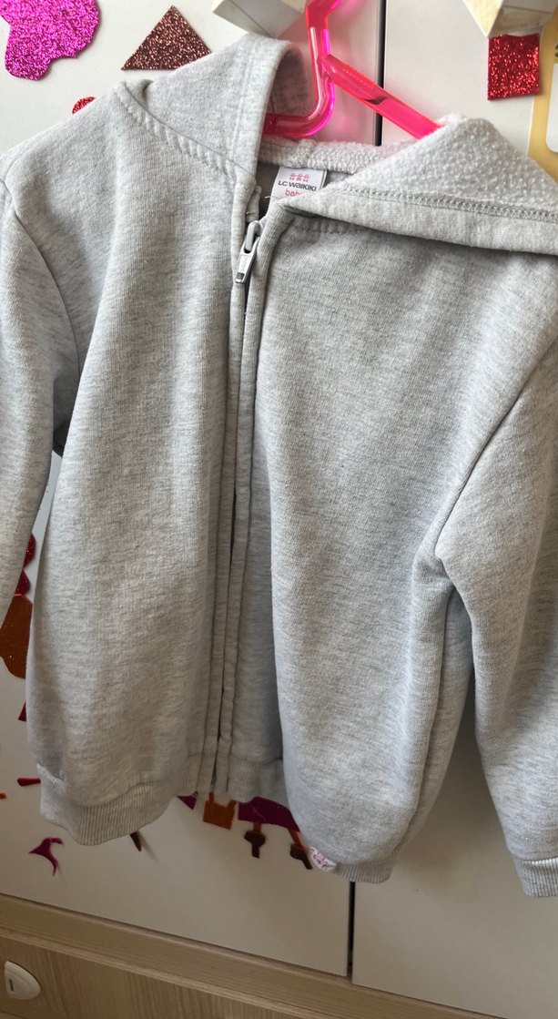 çocuklar için gri renkte, kapüşonlu ve fermuarlı, yumuşak ve sıcak tutan kumaştan yapılmış, düz ve sade tasarımlı, uzun kollu, dar kesim sweatshirt.