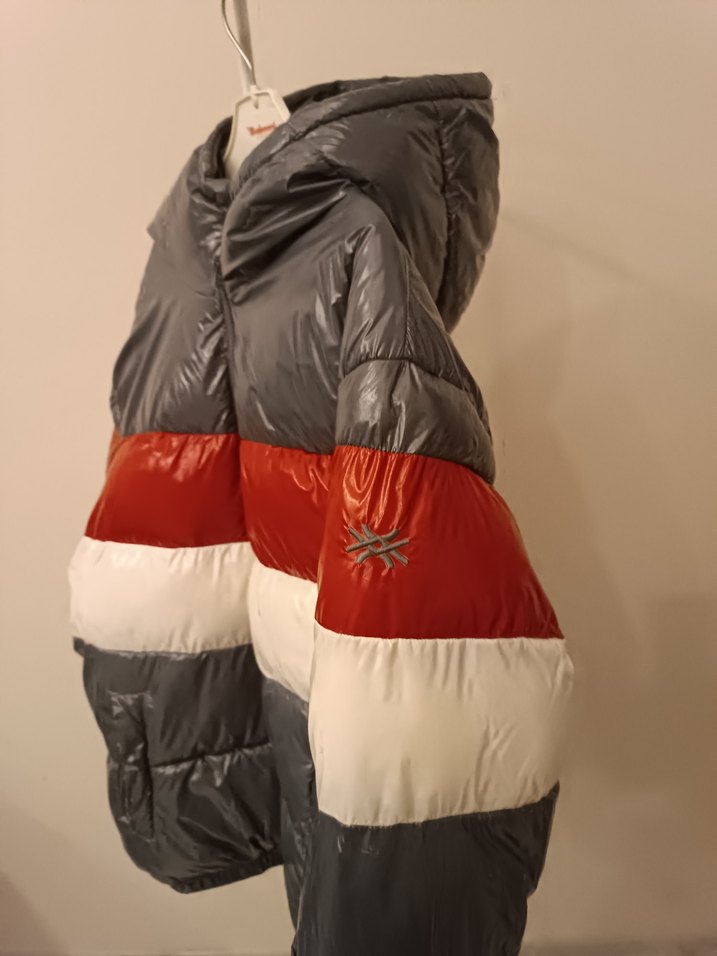 çocuk için yüksek yakalı, fermuarlı, midi boy, fitted kesim gri, kırmızı ve beyaz renk bloklu sentetik kumaştan şişme mont. Günlük ve sokak stiline uygun.