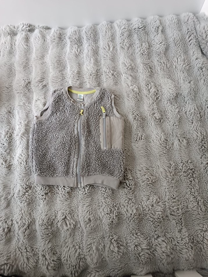 Çocuklar için gri renkte, kolsuz, kürk detaylı yumuşak kumaştan yapılmış, bol kesim ve bisiklet yaka yelek. Fermuarlı ve küçük cepli.