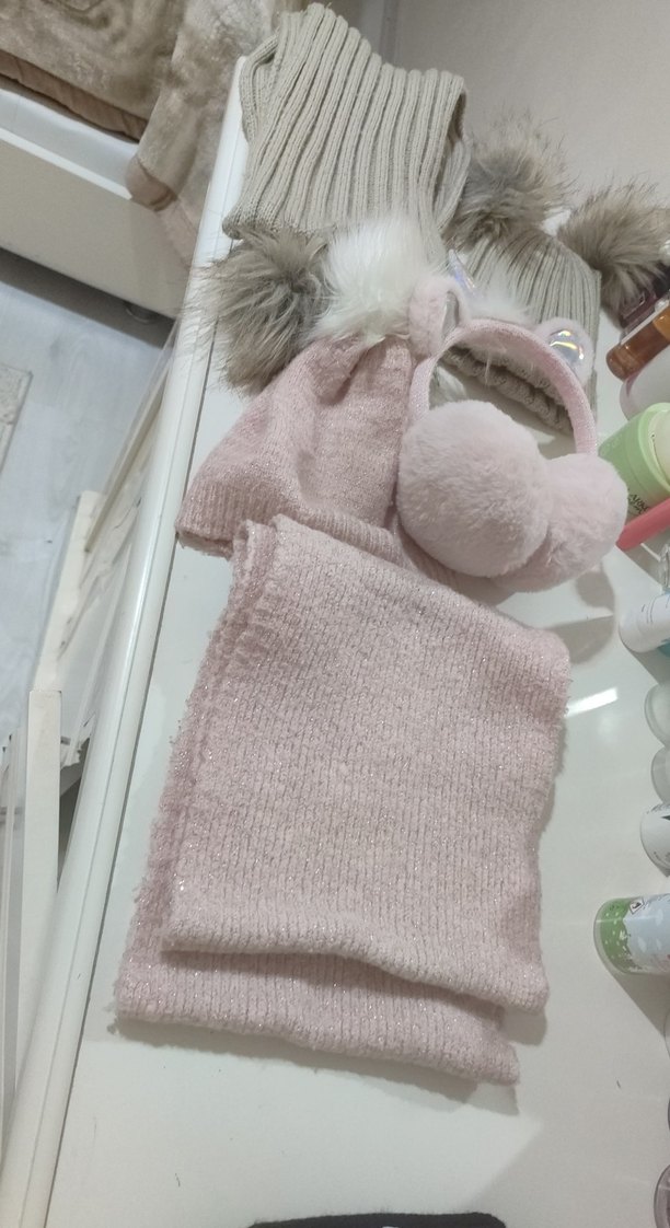 Çocuklar için gri renkte, triko dokulu bere ve yumuşak ponponlu atkı seti, rahat ve şık bir görünüm sunar.
