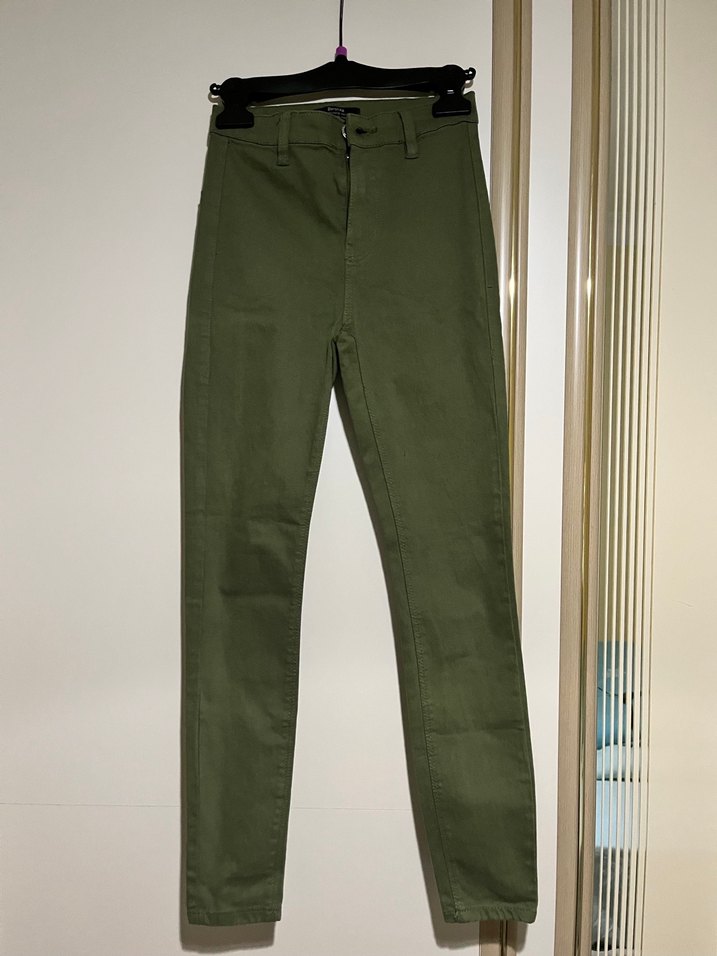 Kadınlar için koyu haki renkte, beli kemerli ve regular fit kesime sahip sentetik kumaştan skinny pantolon. Günlük sokak stiline uygun.
