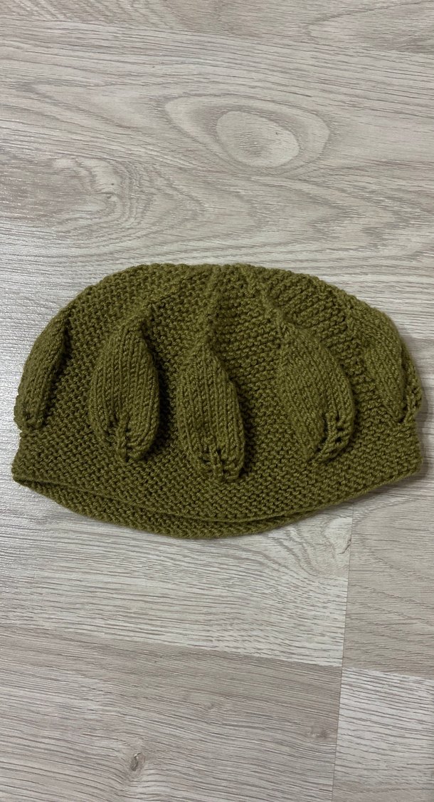 Yumuşak örgüden yapılmış haki renk çocuk bere, rahat bohem tarzda detaylı örgü desenlerine sahip.